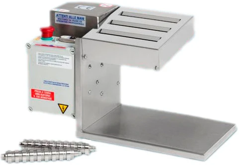 Конструкция лапшерезки Mec TF 180х3 состоит из прочного стального корпуса, электромеханической системы управления, трех отсеков для загрузки теста, а также подставки. Длина каждого отверстия для загрузки теста составляет 180 мм. Для нарезки теста используются три резака из нержавеющей стали.