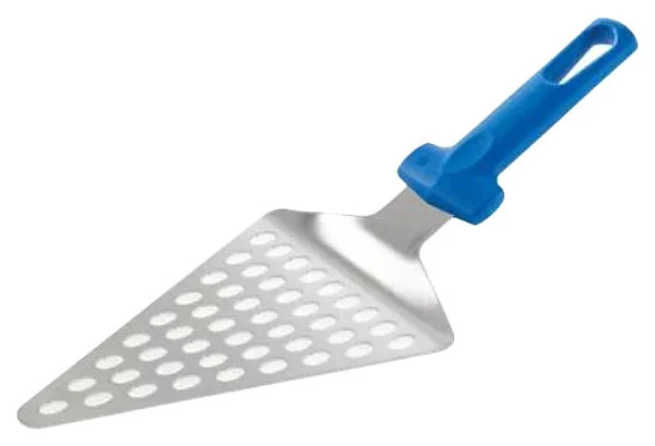 Лопатка для пиццы Gimetal AC-STP15F используется на предприятиях пищевой промышленности, общественного питания и торговли, а также в домашних условиях в процессе сервировки для выкладки пиццы и других хлебобулочных изделий. Модель оснащена головкой треугольной формы с бортиком у основания и короткой рукояткой с отверстием для подвешивания. Головка изготовлена из высококачественной нержавеющей стали с выполненной методом лазерной проточки перфорацией, рукояка – из прочного полимера голубого цвета.