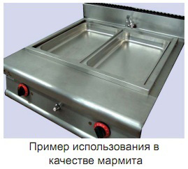 Возможен вариант использования как мармита (каждая секция для размещения гастроемкости GN 1/1*150 или емкости кратного размера); плиты для приготовления блюд путем медленного томления в гастроемкостях; финишинга полуфабрикатов, упакованных в вакуумную упаковку; размораживания продуктов.
