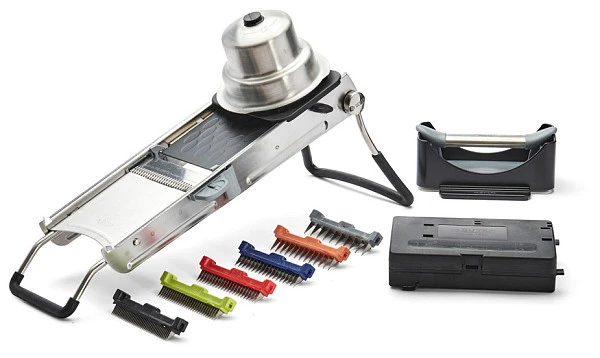 В комплекте: одно двойное (сплошное и волнистое) горизонтальное лезвие, шесть лезвий "жульен" 2-3-4-5-7-10 мм, стандартный круглый толкатель из металла, удлиненная каретка, точилка для лезвий.