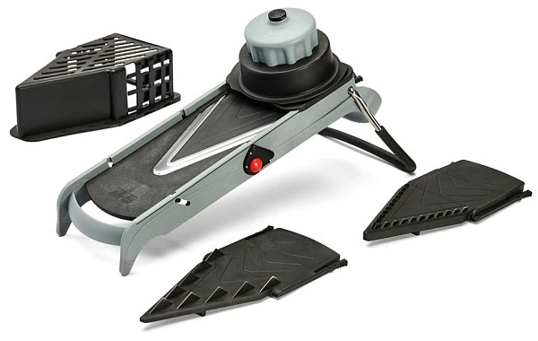 В комплекте: толкатель, V-образное лезвие, два фигурных лезвия "жульен" 4 и 10 мм.