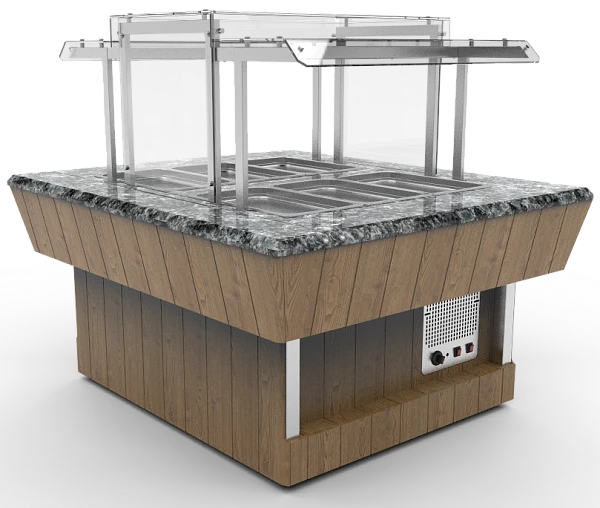 Мармит имеет светодиодную подсветку в нишах фасадных частей и подсветку рабочей зоны (световое оборудование под стеклянной полкой.