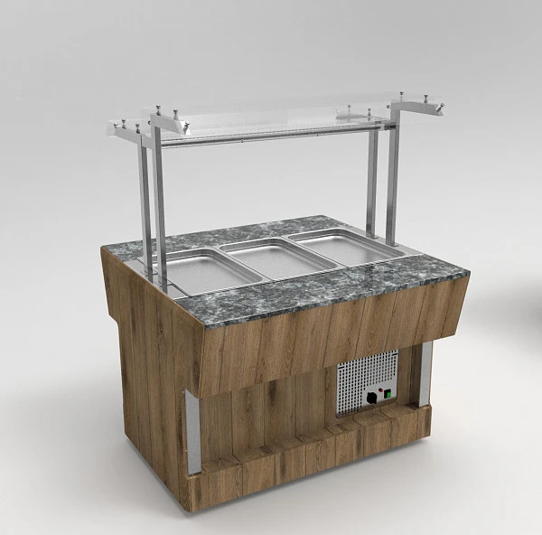 Мармит имеет светодиодную подсветку в нишах фасадных частей и подсветку рабочей зоны (световое оборудование под стеклянной полкой.