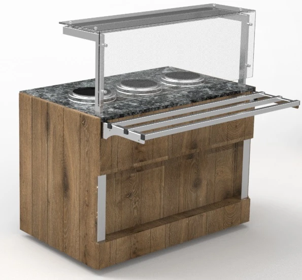 Мармит оснащен полкой и защитными стеклами.