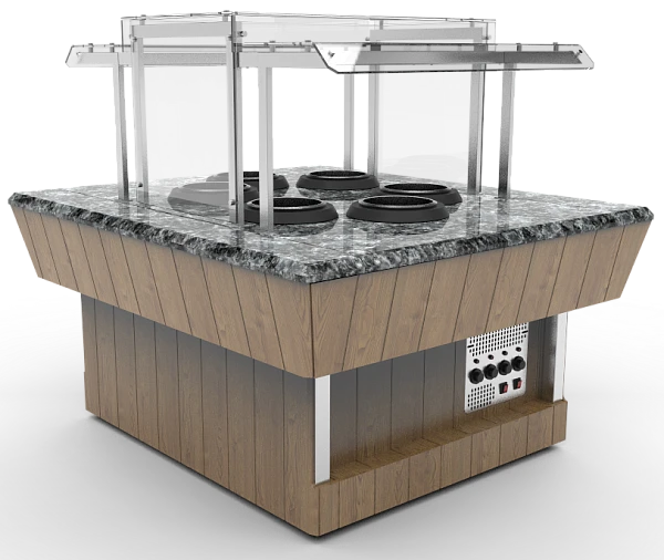 Мармит имеет светодиодную подсветку в нише фасадной части и подсветку рабочей зоны.