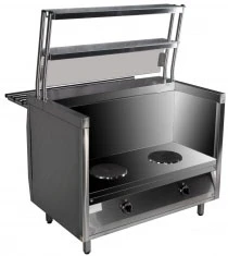 Расположенная на высоте тележек полка с конфорками позволяет легко перемещать тяжелую наплитную посуду для хранения на мармит.
