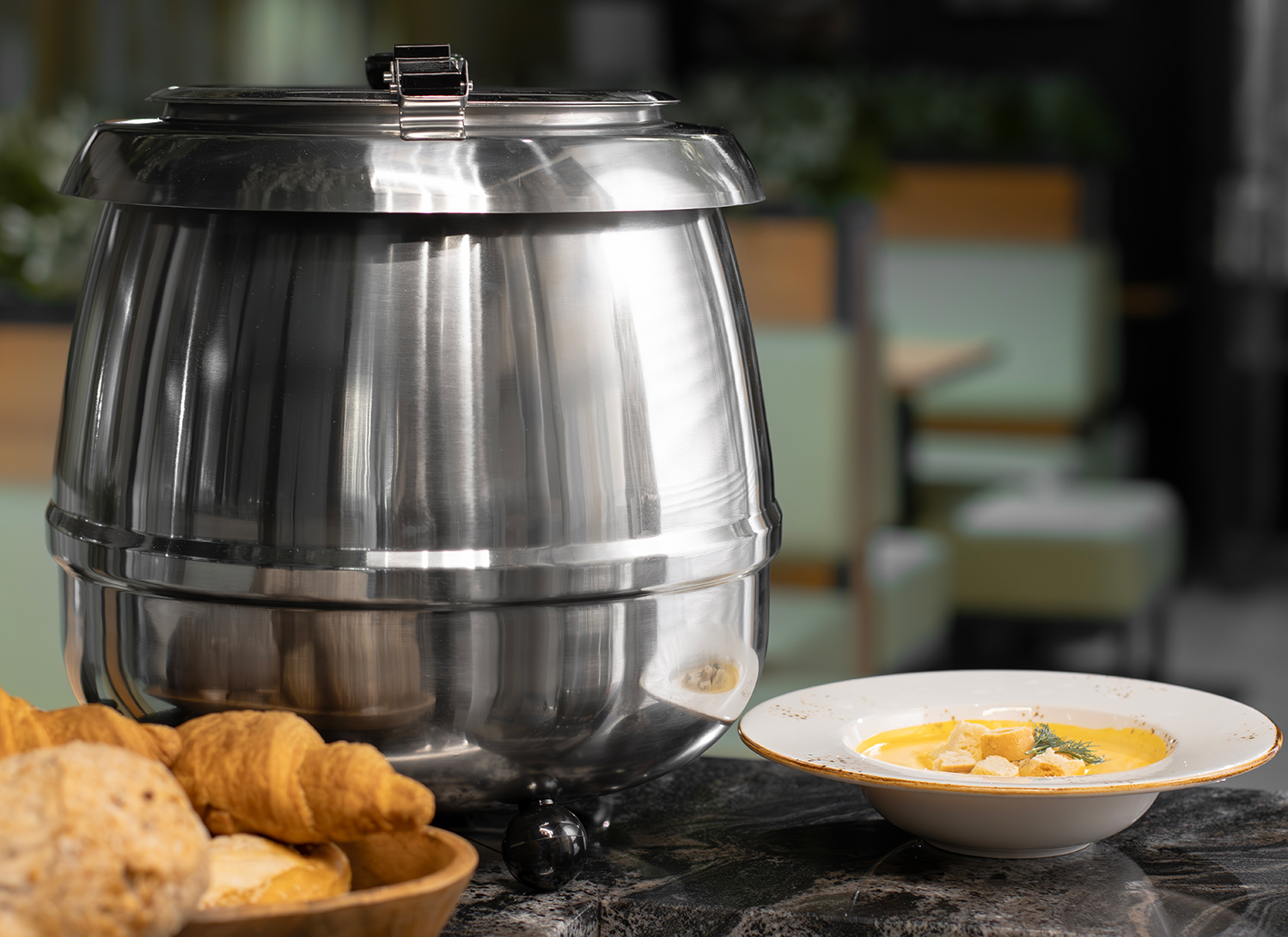 Мармит с водяным нагревом. Объем — 10 литров, температурный режим от 35 до 95 °C, внутренняя чаша из нержавеющей стали, снаружи так же нержавеющая сталь.