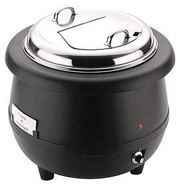 Мармит первых блюд Sunnex 10 л 82328-1 предназначен для постоянного подогрева первых блюд и поддержания их оптимальной температуры на предприятиях общественного питания и торговли. Модель оснащена съемной крышкой с рукояткой, отверстием для половника и электромеханической панелью управления. Корпус в форме горшочка выполнен из термостойкого полипропилена черного цвета, емкость и крышка – из высококачественной нержавеющей стали с серебристой поверхностью.