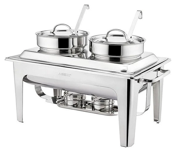 Мармит первых блюд Sunnex 4 л X58229 предназначен для постоянного подогрева первых блюд и поддержания их оптимальной температуры на предприятиях общественного питания и торговли. Модель прямоугольного сечения оснащена 2 отделениями с емкостями круглого сечения и 2 съемными крышками с рукоятками и отверстиями для половников. Корпус выполнен из высококачественной нержавеющей стали с серебристой поверхностью.