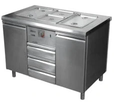 Тип мармита и комплектация: ТЭНы сухого хода, 5 емкостей GN, инвентарный шкаф для посуды, 3 ящика для приборов