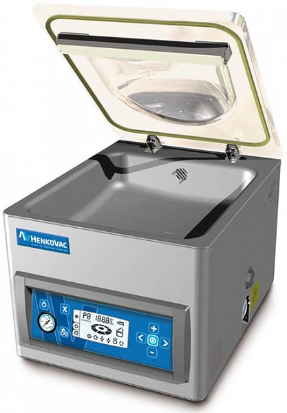Машина вакуумной упаковки Henkovac T2 с корпусом из нержавеющей стали и с прозрачной крышкой рассчитан на маленькие производства и небольшие объемы упаковываемой продукции.