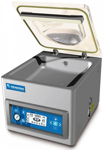Машина вакуумной упаковкик Henkovac T4 с корпусом из нержавеющей стали и с прозрачной крышкой рассчитан на маленькие производства и небольшие объемы упаковываемой продукции.