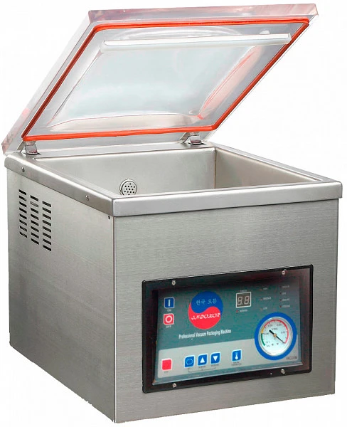 Корпус и камера вакуумного упаковщика выполнены из пищевой нержавеющей стали, что увеличивает износостойкость к агрессивным средам.