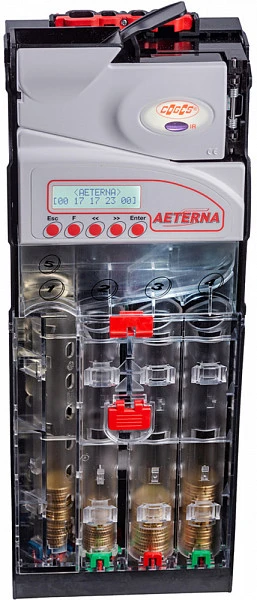 Монетоприёмник Coges Aeterna с функцией выдачи сдачи используется совместно с торговыми автоматами. Новейший блок распознавания монет, скорость распознавания достигает значения 3 монеты в секунду