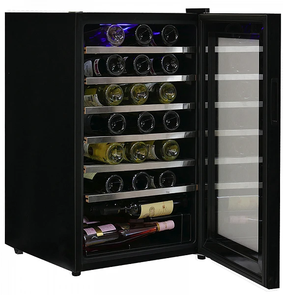 Элегантный дизайн холодильника для вина характеризуется как эргономичный и стильный, он имеет выдвижные металлические полки, которые облегчают размещение на них вина.