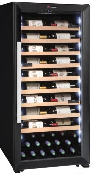 Винный шкаф монотемпературный Climadiff CPF100B1. Особенность данного шкафа заключается в 9 выдвижных полках, на которых бутылки лежат этикеткой к стеклу, что позволяет эффективно использовать винный шкаф не только для хранения, но и для демонстрации и продажи, в частности в ресторанах и в винных бутиках.