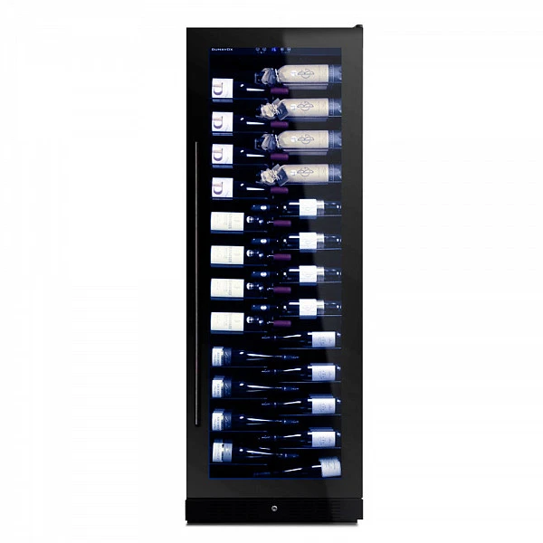 Шкаф вмещает в себя 143 бутылки типа Бордо, имеет одну зону охлаждения и поддерживает температуру от +5°C до +22°C. В верхней части есть сенсорная панель, с помощью которой пользователь выбирает необходимый температурный режим работы в камере. На ней также расположены сенсорные кнопки для регулировки температуры и включения освещения. Данные термостата демонстрирует цифровой экран с приятной светодиодной подсветкой синего цвета.