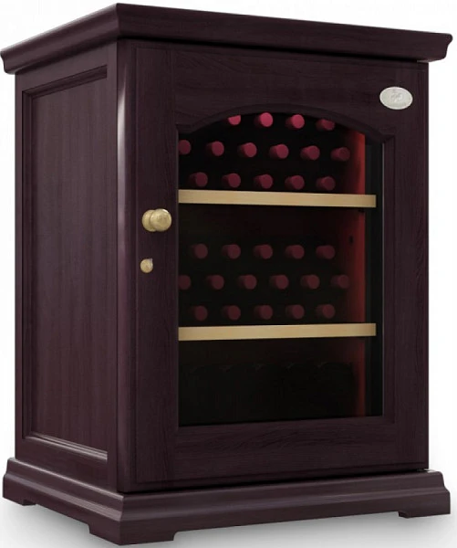 Корпус холодильника металлический, внешняя отделка винного шкафа выполнена из древесины Risto Line в четырех цветовых решениях. Дверца с двойным тонированным стеклопакетом с защитой от уф лучей, имеет встроенный замок и удобную ручку в классическом стиле.