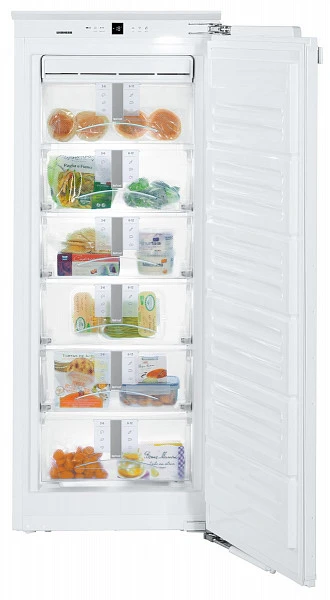Большой морозильник высотой 140 см и объемом 186 литров может встраиваться бок о бок с холодильным шкафом. Жесткое крепление мебельного фасада прямо на дверцу по системе door-on-door придает конструкции особую прочность, а дверца при этом может открываться на угол до 115 градусов. Регулируемые ножки помогут установить холодильник строго вертикально. Доводчик с системой амортизации SoftSystem позволяет плавно прикрывать дверь. Электронная панель управления с сенсорными кнопками и ЖК-дисплеем MagicEye с цифровой индикацией температуры удобно располагается за дверцей в верхней части корпуса. Функции панели управления можно заблокировать от детей. Для лучшего обзора содержимого предусмотрено экономичное и яркое светодиодное освещение. Система охлаждения NoFrost полностью исключает ручное размораживание, так как на стенках камеры не образуется лед и иней. Обогрев боковой стенки гарантирует безопасность других кухонных приборов и техники при встраивании. Система Vario служит для извлечения полок и ящиков, если продукты в них не помещаются. Два аккумулятора холода позволяют 34 часа поддерживать низкую температуру при отключении электричества.