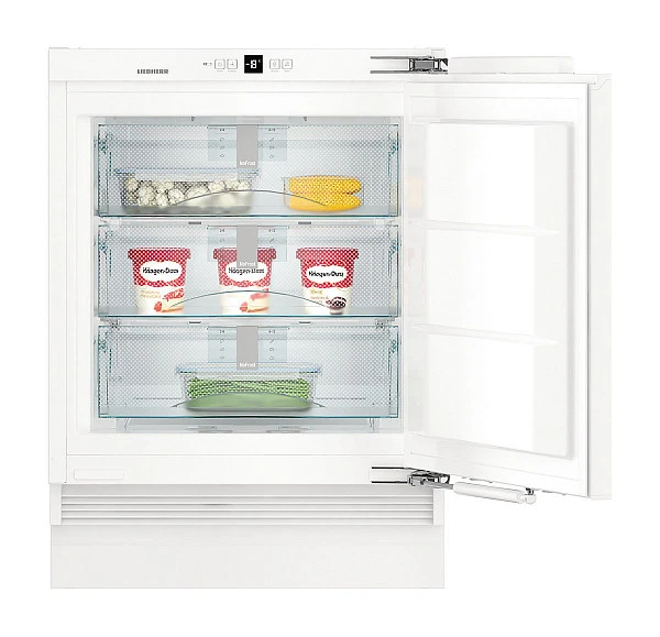 Liebherr SUIGN 1554 — встраиваемая морозильная камера с перенавешиваемой дверцей. Объем 95 литров позволяет долговременно хранить значительные запасы. Жесткое крепление дверцы door-on-door способствует надежности конструкции и позволяет открывать дверцу на угол 115°. Высота 82 см позволяет установить ее под столешницей. Производительность замораживания составляет 11 кг продуктов в сутки. Если произошло отключение электропитания, продукты сохранят свое качество в течение 15 часов с помощью аккумуляторов холода. О том, что срок хранения заканчивается, предупредит FrostControl.
