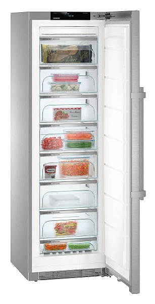 Большая модель объемом 315 литров и высотой 185 см оснащена системой размораживания NoFrost, которая препятствует образованию льда и инея и значительно облегчает уход. Морозильник можно устанавливать вплотную к стене или side-by-side с холодильной камерой. Дверца со сменным уплотнителем имеет защитное покрытие от отпечатков пальцев SmartSteel и оснащена удобной алюминиевой ручкой со встроенным толкателем. За дверцей в верхней части находится электронная панель управления с 2,4-дюймовым сенсорным цветным TFT-дисплеем. Производительность замораживания камеры достигает 18 кг продуктов в сутки. Благодаря двум аккумуляторам холода продукты сохраняются в замороженном виде в течение 18 часов после отключения электроэнергии. Дополнительно можно подключить модуль SmartGrid-ready, который автоматически увеличивает интенсивность охлаждения в часы с самым низким тарифом на электроэнергию. Режим SuperFrost позволяет замораживать свежие продукты с сохранением всех полезных веществ, понижая температуру до −32°С, а затем автоматически возвращаясь к прежним настройкам. О возникших неисправностях предупредит звуковая и световая сигнализация.