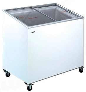 Низкотемпературный ларь с прямым наклонным стеклом D 300 СE предназначен для хранения продуктов при температурном режиме -12°…-22°.