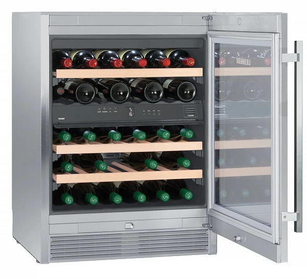 Винный шкаф двухзонный Liebherr WTes 1672 высотой 82 см можно разместить под столешницей. Прибор имеет 2 независимые зоны, температура в которых регулируется в диапазоне от +5°С до +20°С, что позволяет хранить в нем одновременно несколько сортов вина. Корпус полностью изготовлен из высококачественной стали и дополнен стальной вертикальной ручкой. Двухслойный стеклопакет с тонировкой препятствует проникновению УФ-излучения. В камере поддерживается оптимальная влажность воздуха, предохраняющая винные пробки от высыхания. Высокий класс энергопотребления А гарантирует минимум затрат на электричество. Светодиодную подсветку при необходимости можно отключить. Внутренняя электронная панель управления MagicEye оснащена ЖК-дисплеем, цифровым термометром и сенсорными кнопками. Мощный компрессор работает очень тихо, уровень шума достигает всего 38 дБ. Равномерное охлаждение всего пространства камеры обеспечивает система вентиляции. Фильтр из активированного угля эффективно очищает воздух от посторонних запахов.