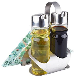 Набор для специй Viatto из 3 предметов: бутылочка для масла 140 мл, бутылочка для уксуса 140 мл, подставка с салфетницей. Баночки изготовлены из стекла. Крышки и подставка – из нержавеющей стали.