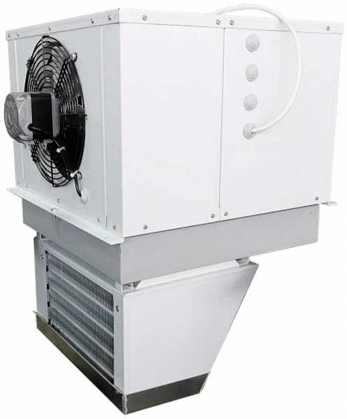 Холодильная установка, выполненная в виде единого блока, испарительная часть (воздухоохладитель) которого устанавливается во внутренний объем холодильной камеры, а компрессорно-конденсаторный блок – снаружи.