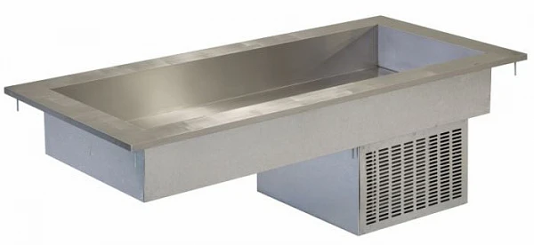 Ванна сварная, выполнена из нержавеющей стали AISI 304, внешний размер ванны – 1500х700х205 мм, внутренний – 1326х514х205 мм. Охлаждение ванны осуществляется агрегатом Danfoss, расположенным в нижней части модуля. Охлаждение происходит за счет хладагента – фреон R 22. Стол предусматривает размещение в ванне трех гастроемкостей GN 1/1 максимальной глубиной 150 мм. Для возможности установки гастроемкостей GN 1/2, 1/3 предусмотрены съемные перемычки из нержавеющей стали П-образной формы. Температура в охлаждаемом объеме обеспечивается в пределах от -2°С на поверхности до +10°С на высоте 60 мм от поверхности ванны. Охлаждаемый стол предназначен для размещения в нем гастроемкостей GN 1/1, для установки гастроемкостей GN1/2, 1/3 предусмотрены съемные перемычки из нержавеющей стали П-образной формы, глубина гастроемкостей – не более 150 мм.