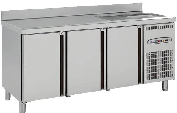 Стол холодильный кондитерский 60*40 см с мойкой, расположенной справа над агрегатным отсеком, 3 двери (3 пары направляющих под полки и 3 полки в комплекте поставки).