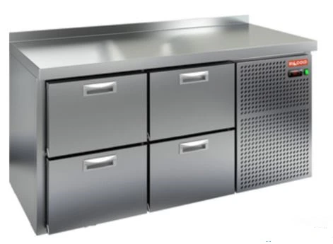 Охлаждаемый стол Hicold GN 22 BR2 TN с четырьмя ящиками и боковым расположением агрегата предназначен для обработки ингредиентов для приготовления блюд, а также кратковременного хранения скоропортящихся продуктов и напитков на предприятиях общественного питания и торговли.