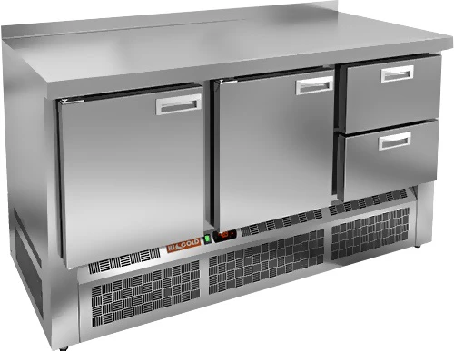 Охлаждаемый стол Hicold GNE 112/TN с распашными дверцами, двумя ящиками и нижним расположением агрегата предназначен для обработки ингредиентов для приготовления блюд, а также кратковременного хранения скоропортящихся продуктов и напитков на предприятиях общественного питания и торговли.