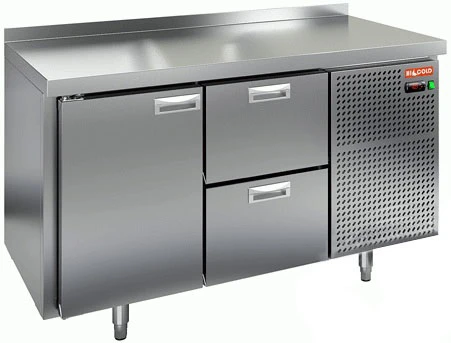 Охлаждаемый стол Hicold SN 12/TN с распашной дверцей, двумя ящиками и боковым расположением агрегата предназначен для обработки ингредиентов для приготовления блюд, а также кратковременного хранения скоропортящихся продуктов и напитков на предприятиях общественного питания и торговли.