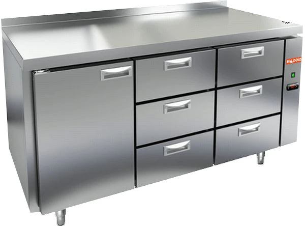 Охлаждаемый стол Hicold SN 133/TN P (без агрегата) с распашной дверцей, шестью выдвижными ящиками предназначен для обработки ингредиентов для приготовления блюд, а также кратковременного хранения скоропортящихся продуктов и напитков на предприятиях общественного питания и торговли.