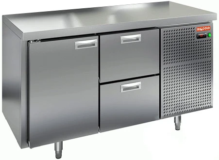 Охлаждаемый стол Hicold SNS 12/TN O с распашной дверцей, двумя ящиками и боковым расположением агрегата предназначен для обработки ингредиентов для приготовления блюд, а также кратковременного хранения скоропортящихся продуктов и напитков на предприятиях общественного питания и торговли.