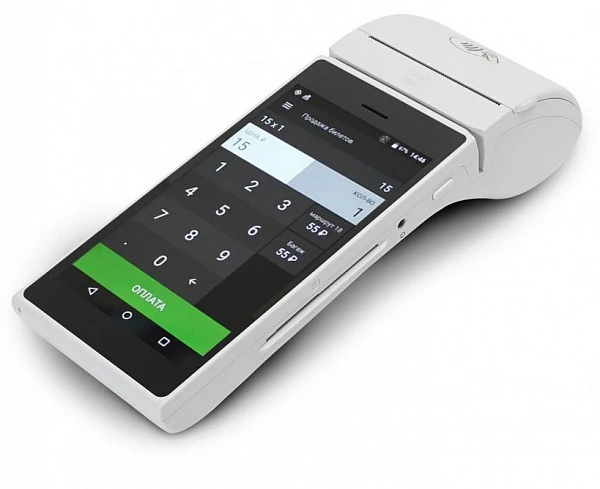 Мобильная касса оснащена сенсорным экраном и встроенным сканеров штрих-кодов. Устройство поддерживает эквайринг. Для приема оплаты по эквайрингу следует приложить банковскую карту или смартфон к аппарату.