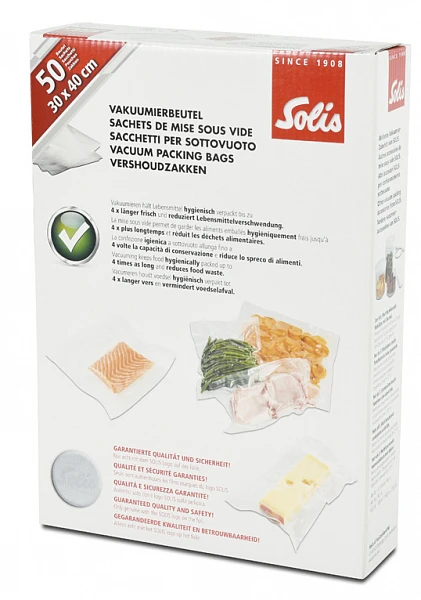 Пакеты для вакуумной упаковки Solis Vac 30*40 предназначены для вакуумирования продуктов в домашних условиях. Если вы хотите сохранить качество ваших продуктов, поместите их в вакуумные пакеты и рулоны от Solis. Толщина пленки 110 мкм обеспечивает непроницаемость для кислорода.