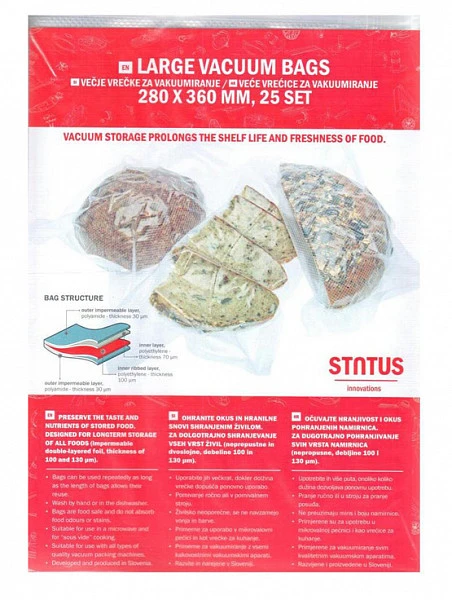 Вакуумные пакеты и рулоны STATUS производятся в Словении. Все используемые материалы европейского производства со всеми необходимыми сертификатами. Наши пакеты и рулоны для вакууматоров безопасны для продуктов питания и не передают продуктам посторонний вкус и запах. Для вас это означает, что вы можете использовать их для хранения всех видов продуктов, не задумываясь, и ваша еда сохранит свой естественный вкус и аромат. Наши вакуумные пакеты также подходят для заморозки и приготовления пищи.
