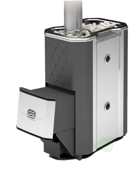 Сибирь очень мощная и эффективная. Камни в корзине каменки прогреваются с пяти сторон и дают много лёгкого пара. Выход дымохода у печи классический – смещенный к переднему краю печи. Такое расположение дымохода обеспечивает максимальный доступ к каменке.