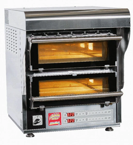 Печь подовая электрическая неразборная двухкамерная с подом из шамотного камня размером 39*39 см для приготовления одновременно 2 пицц диаметром 35 см.