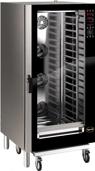 Конвекционная печь Apach A3/16HD-E линии A3 со встроенной автомойкой предназначена для выпекания или разогрева кондитерских и хлебобулочных изделий, готовых блюд, замороженных или предварительно выдержанных в расстоечном шкафу заготовок из теста на предприятиях пищевой промышленности, общественного питания и торговли.