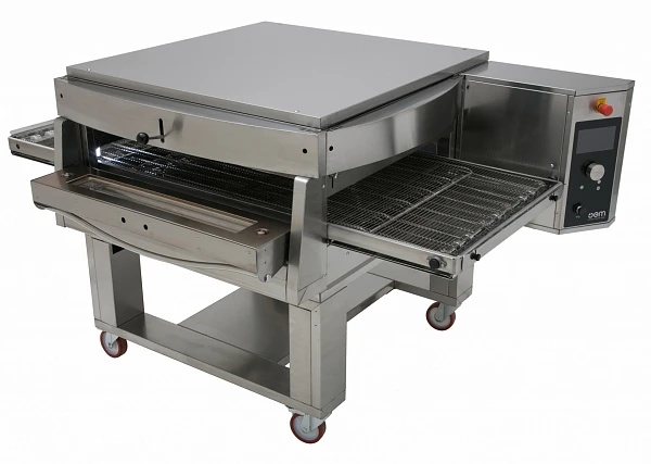 Цифровая панель управления: самоочистка, экономичный режим, режим самодиагностики, контроллер с записью 30 программ выпечки пиццы и 30 специальных программ для гастрономической выпечки, кнопка остановки конвейера.