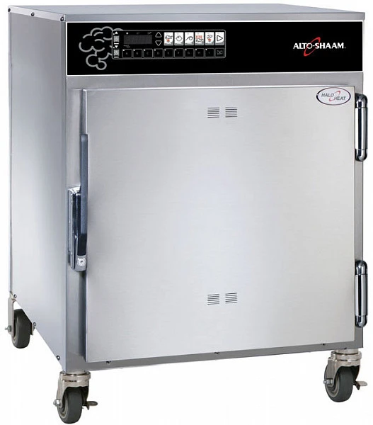 Низкотемпературная печь томления с копчением Alto Shaam 767-SK/III с корпусом из листовой нержавеющей стали 0,95 мм. Дверь оборудована магнитной защелкой. Внутри печи установлены две полностью съемные боковые стойки из немагнитной нержавеющей стали с 11 положениями для противней, отстоящими друг от друга на 35 мм, 2 проволочные полки из нержавеющей стали, 1 стойка из нержавеющей стали для реберной части, съемный жиросборник из нержавеющей стали со сливом и контейнер для древесной щепы. Печь оборудована наружным устанавливаемым спереди жиросборником из нержавеющей стали и мешочками для образцов вишневой, ореховой, яблоневой и кленовой щепы. Печь снабжена одним комплектом 89 мм роликов — 2 с жесткими осями и 2 поворотных с тормозом.