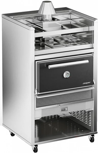 Печь на твердом топливе (хоспер) Josper HJA-25 - это единая конструкция с надстройкой и шкафом-подставкой. Надстройка представляет собой тепловую зону с направляющими под гастроёмкости. Она может использоваться как для предварительного прогрева мяса перед приготовлением, так и для поддержания температуры готовых продуктов. Шкаф-подставка имеет полку для размещения угля и аксессуаров. Данная модель поставляется в богатой комплектации: в стоимость входят искрогаситель, колпак искрогасителя и две гриль-решетки! Рекомендуется в заведения с количеством посадочных мест до 70.