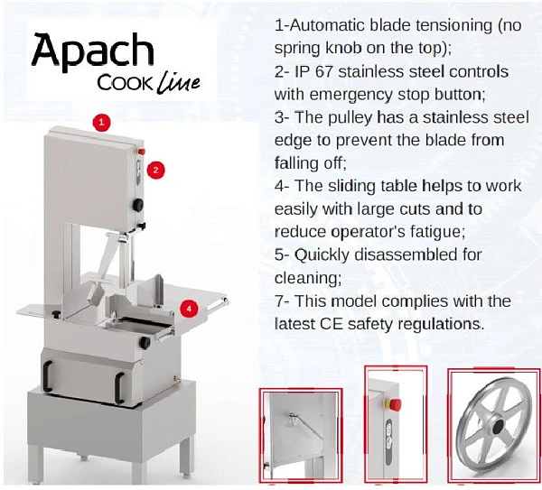 Пила для резки мяса Apach ASW240I 3Ф CE предназначена для профессионального использования. Применяется для распилки костей, замороженных мясных брикетов, рыбы и птицы на кусочки заданной толщины. Специально разработана для интенсивного использования в мясных цехах супермаркетов, при разделке на мини-производствах, фабриках-кухнях.