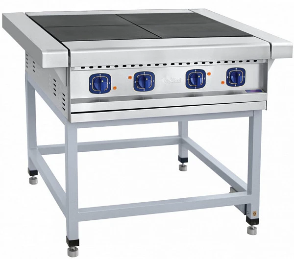 Плита электрическая Abat ЭП-4П четырехконфорочная без жарочного шкафа на подставке предназначена для приготовления первых, вторых, третьих блюд в наплитной посуде, а также для жарки полуфабрикотов из мяса, рыбы, овощей и выпечки мелко штучных кулинарных изделий.