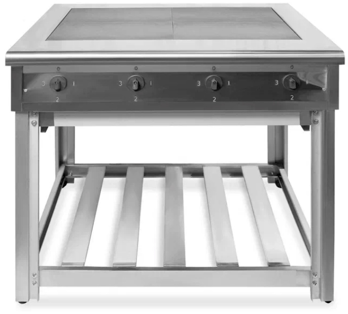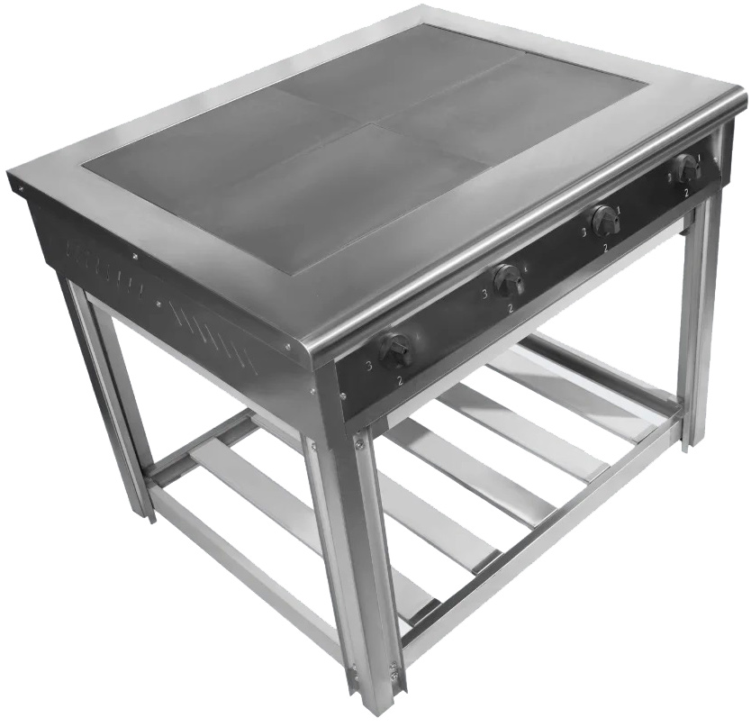 Плита электрическая OBOD ЧП-04 предназначена для приготовления первых, вторых и третьих блюд. Плоские прямоугольные чугунные конфорки, плотно прилегающие к друг другу, вместе с двумя боковыми столешницами обеспечивают удобное перемещение посуды по всей поверхности плиты. Максимальная температура конфорок — 480 °C.