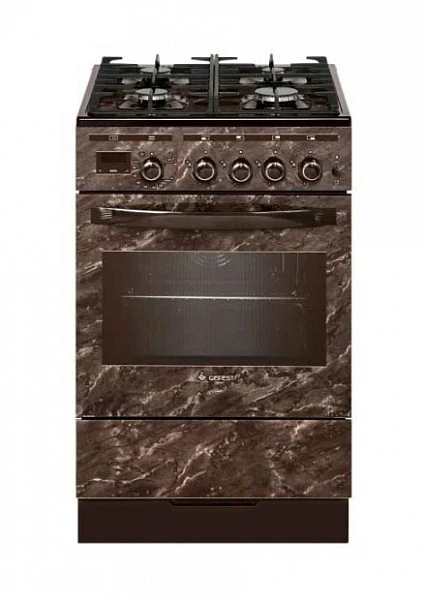 Плита газовая Gefest ПГ 5500-03 0054 выполнена в коричневом цвете, фасад оформлен рисунком с имитацией мрамора и декорирован стеклянными панелями.
