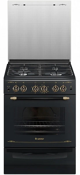 Плита газовая Gefest ПГ 6100-02 0183 черная газовая плита шириной 60 см, ретро-дизайн с декорированными элементами управления и рисунком, нанесенным на эмалированный фасад.